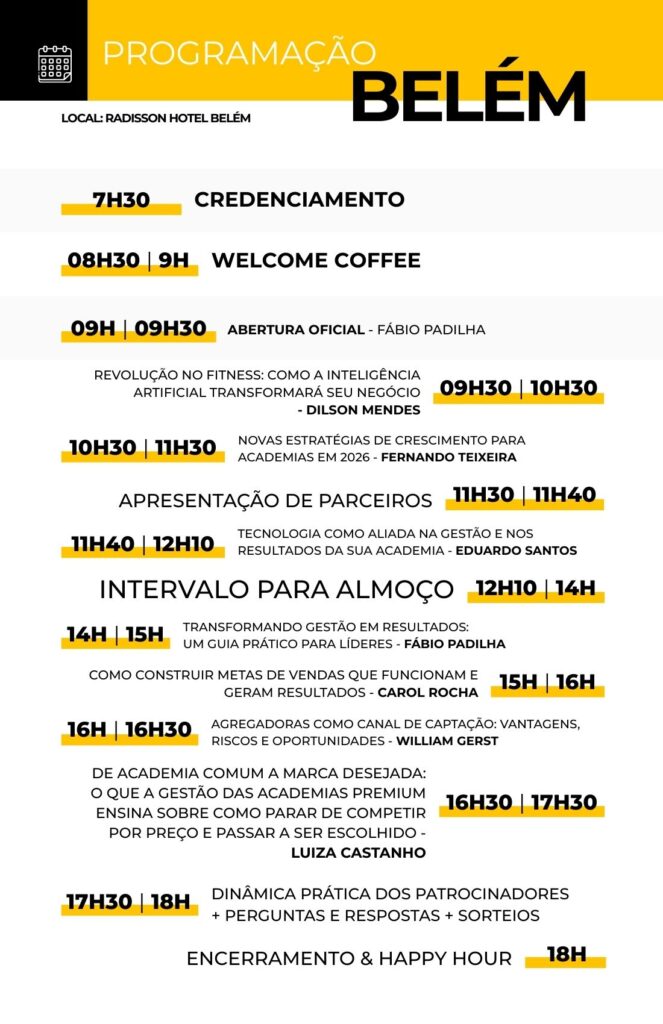 É uma imersão prática, direta e aplicável, onde gestores aprendem com quem vive a realidade do mercado fitness, trocam experiências e saem com planos de ação claros para aplicar no dia seguinte.